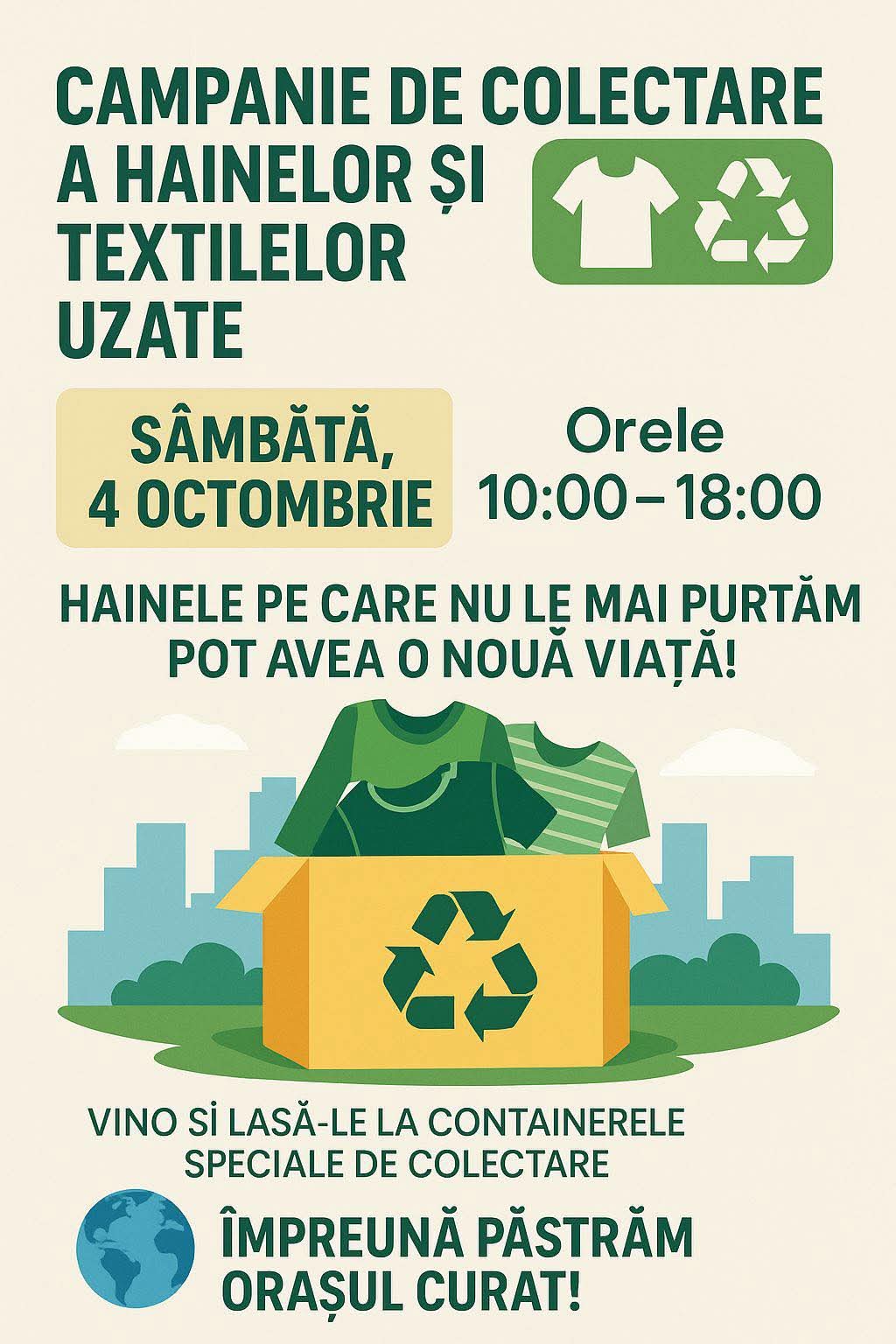 Sâmbătă, 4 octombrie, între orele 10:00 – 18:00, locuitorii municipiului [...]