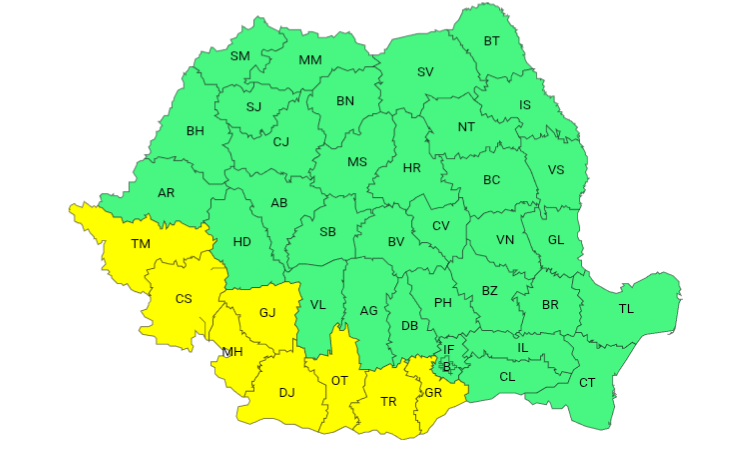 ANM a emis COD GALBEN DE CANICULĂ, pentru astăzi, 4 iunie, în intervalul 12.00 ora 21.00. Sunt prognozate temperaturi deosebit de ridicate și disconfort termic. În cea mai mare parte a țării, se vor înregistra temperaturi deosebit de ridicate pentru această dată, iar disconfortul termic va fi în creştere. Temperaturile maxime vor fi cuprinse între 33 și 36 de grade, cele mai mari valori urmând a se înregistra izolat în Banat și sud-vestul Olteniei.
