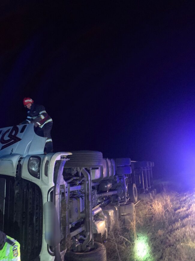 Un accident rutier a avut loc în cursul acestei dimineți, pe DN 56A, localitatea Recea, din județul Mehedinți. Șoferul unui autotren a pierdut controlul direcției de mers și s-a răsturnat în afara părții carosabile. La sosirea pompierilor, o persoană conștientă se autoevacuase și a refuzat evaluarea medicală.