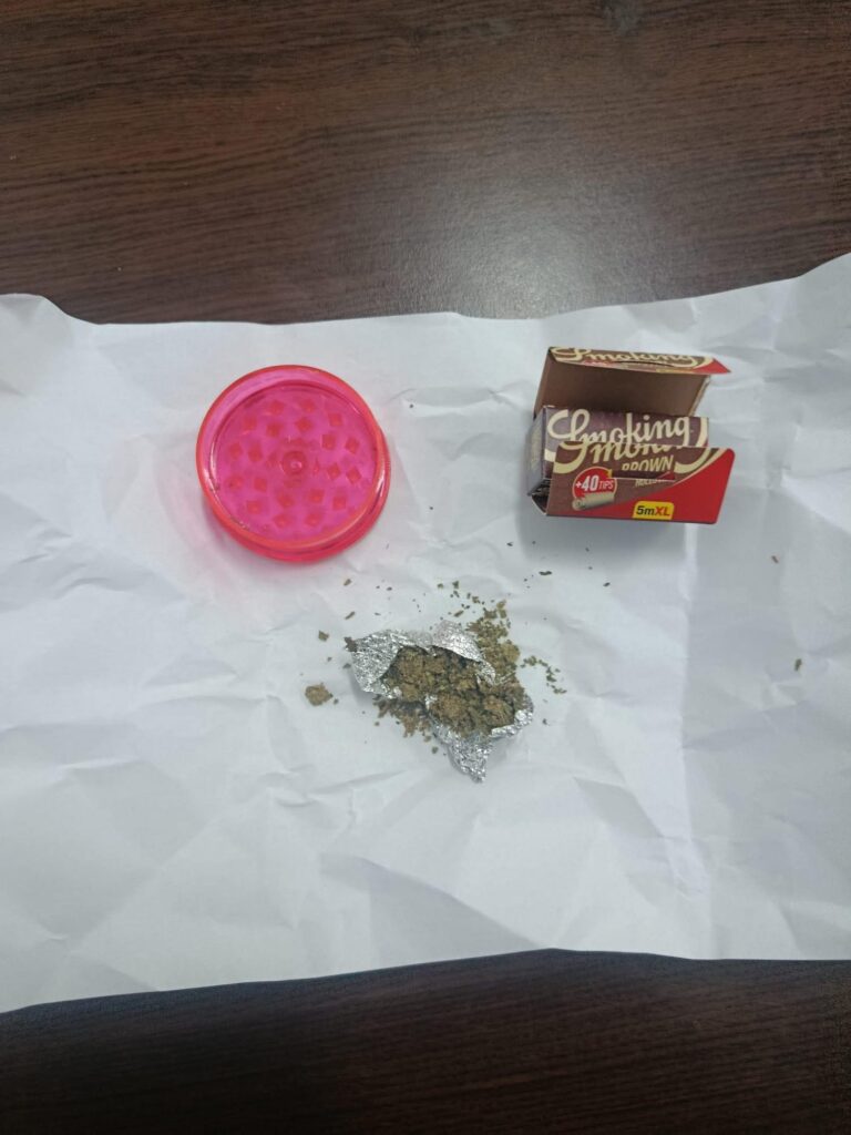 În urma controlului corporal preventiv, jandarmii au descoperit asupra bărbatului o bobină din folie de aluminiu care conținea o substanță vegetală de culoare verde-olive, posibil cu efect psihoactiv. De asemenea, urme de substanțe similare au fost găsite într-un recipient din plastic de tip „grinder”, aflat în posesia acestuia, precum și o cutie cu foițe pentru rularea țigaretelor.