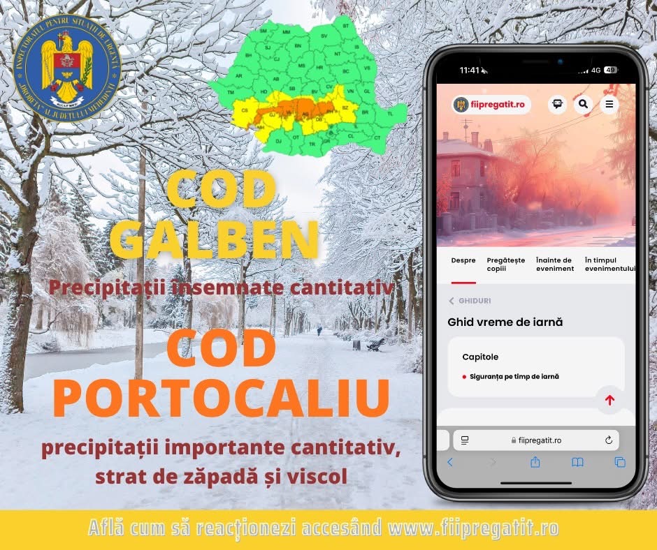 Totodată, zona de munte din nordul județului este vizată de o avertizare Cod Portocaliu, unde sunt prognozate precipitații importante, strat de zăpadă, viscol și intensificări ale vântului. Meteorologii avertizează că, pe arii restrânse, se pot acumula cantități de apă cuprinse între 60 și 80 l/mp.