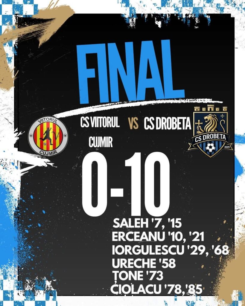Echipa severineană CS Drobeta s-a impus astăzi cu scorul de 10-0 pe terenul celor de la CS Viitorul Cujmir, în etapa recentă a Ligii a IV-a mehedințene.