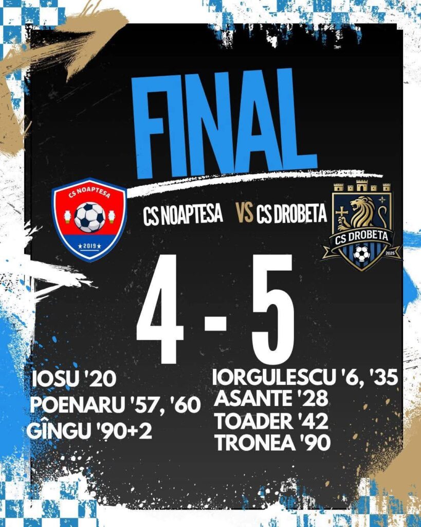 CS Noapteșa nu a renunțat și a încercat o revenire spectaculoasă după pauză. Iosu (’20) deschisese deja tabela pentru gazde, iar Poenaru a semnat o dublă rapidă (’57, ’60), readucându-și echipa în joc. Emoțiile au atins cote maxime în prelungiri: după ce Tronea (’90) a majorat avantajul pentru Drobeta, Gîngu a redus din diferență (’90+2), dar timpul nu a mai permis egalarea.