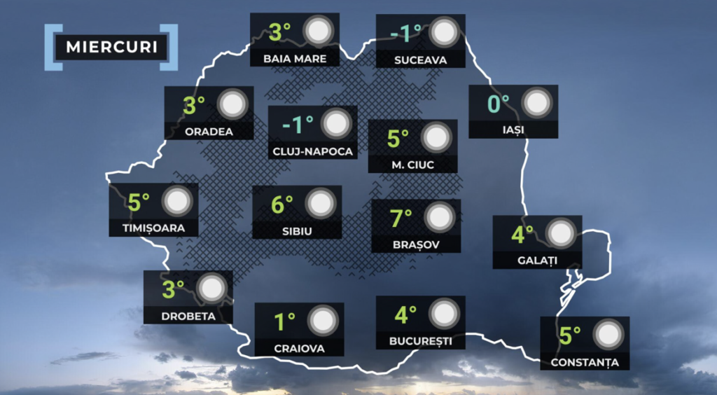 Dimineața va fi extrem de rece, cu temperaturi minime de până la -19°C în depresiuni și zonele montane, iar gerul va fi accentuat în mare parte din țară. Maximele zilei vor atinge 3°C, în timp ce în zonele de câmpie și dealuri valorile se vor situa între -2 și +3°C.