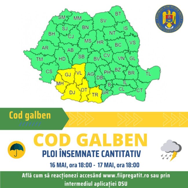 Începând de astăzi, 16 mai, ora 18:00, până miercuri, 17 mai, ora 18:00, județului Mehedinți se va afla sub incidența avertizării meteorologice Cod Galben de ploi însemnate cantitativ, conform informării transmise de către Administraţia Naţională de Meteorologie.