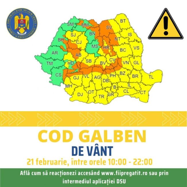 Începând de azi, 21 februarie, ora 10.00, județul Mehedinți se află sub incidența atenționării meteorologice Cod Galben ce vizează intensificări ale vântului valabilă până în această seară, ora 22.00, conform informării transmise de către Administraţia Naţională de Meteorologie.