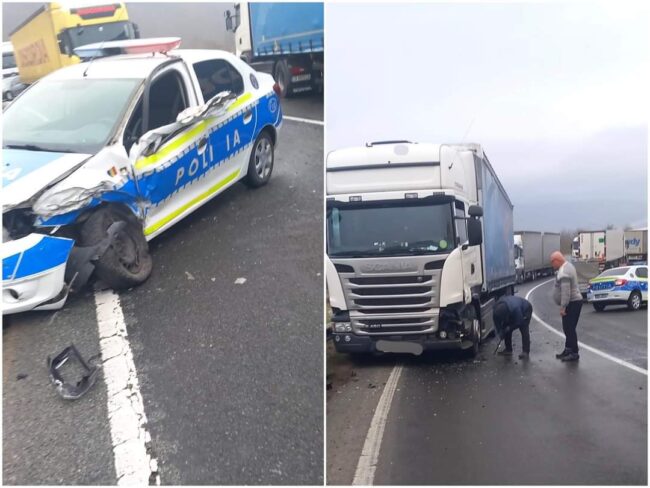 TIR-ul era condus din direcția Orșova spre Caransebeș de un cetățean bulgar în vârstă de 34 de ani, care nu ar fi acordat prioritate de trecere autospecialei de poliție aflată în misiune, intrând în coliziune cu ea.