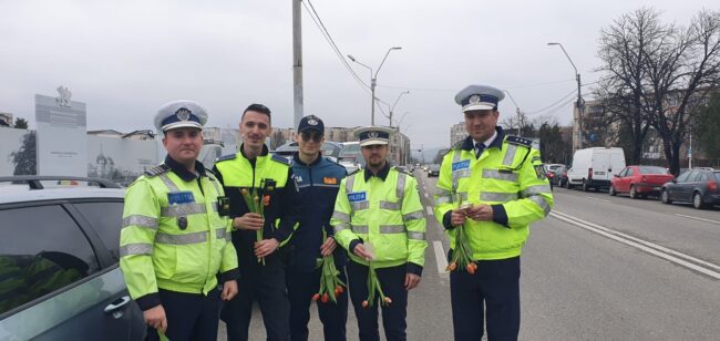 Pe lângă gândurile bune și recomandările polițiștilor, doamnele și domnișoarele au primit flori și mărțișoare.
