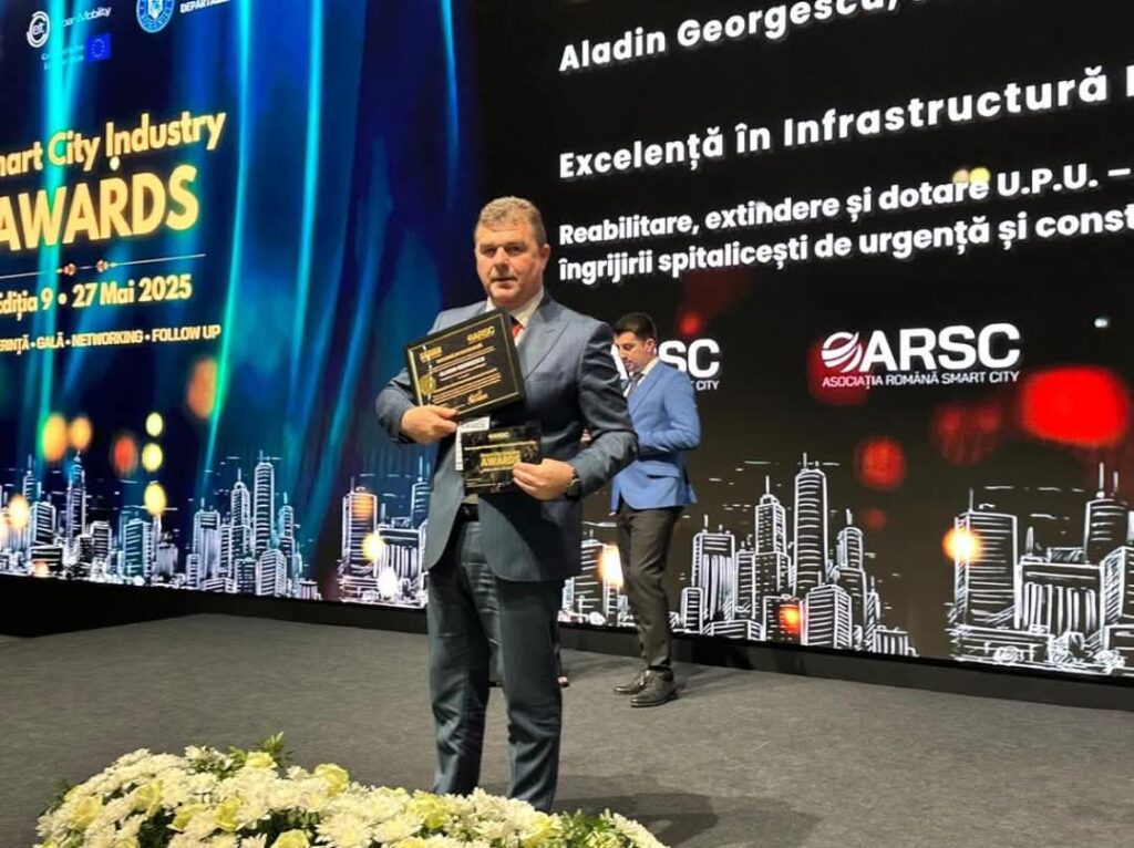 În cadrul Galei Smart City Industry care s-a desfășurat în București, președintele Consiliului Județean Mehedinți, Aladin Georgescu, a fost onorat să primească premiul pentru excelența în infrastructura medicală integrată pentru proiectul de modernizare și extindere a Unității de Primiri Urgențe și construirea heliportului din cadrul Spitalului Județean de Urgență din Drobeta Turnu Severin.