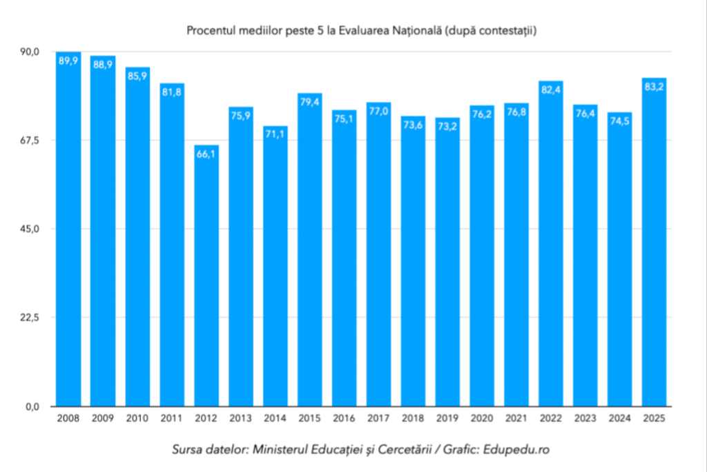 Puțin peste 83% dintre elevii care au susținut anul acesta Evaluarea Națională (EN VIII 2025) au obținut medii peste 5, conform rezultatelor după contestații, transmite într-un comunicat Ministerul Educației și Cercetării (MEC). Este cel mai mare procent din ultimii 16 ani.