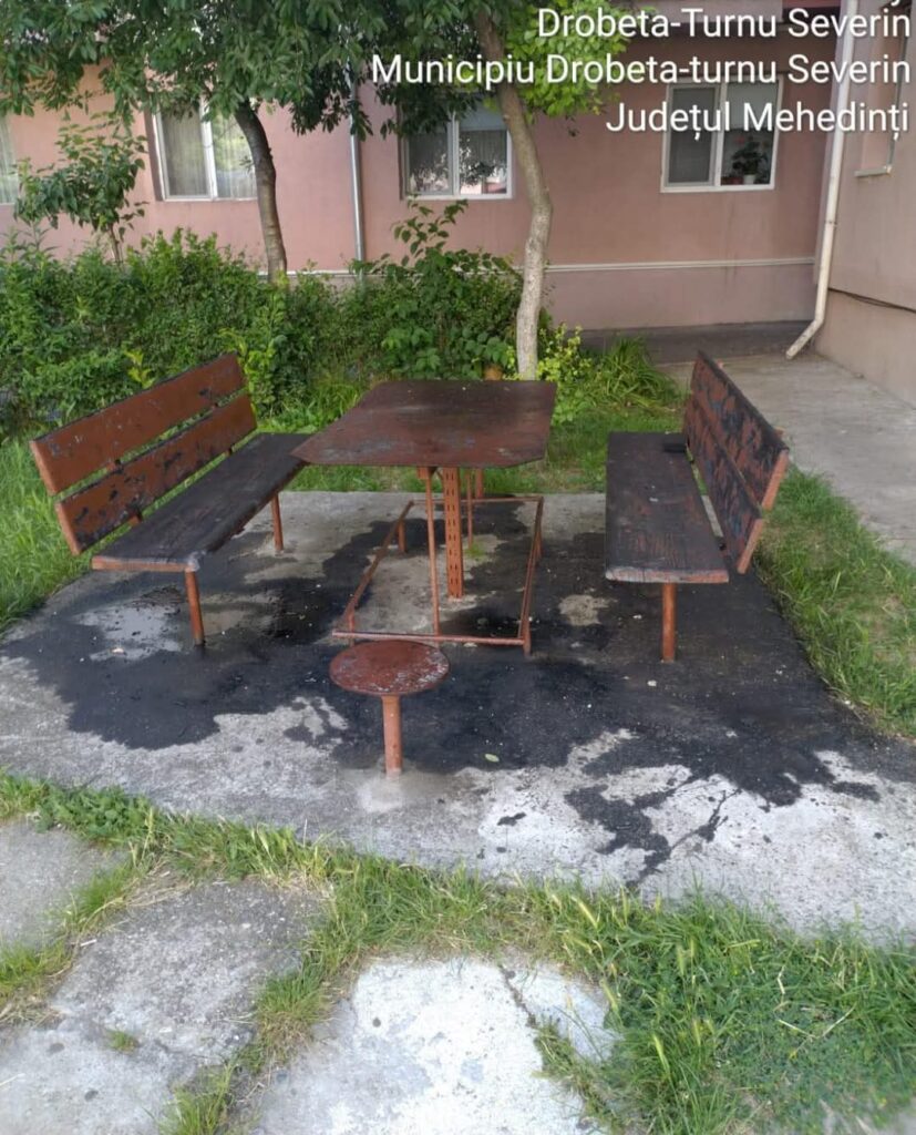Pe timpul activităților de patrulare pe zona de responsabilitate, polițiștii locali din Drobeta Turnu Severin au constatat că ansamblul pentru agrement format dintr o masă și două bănci, amenajat în fața unui bloc de locuințe, a fost murdărit cu ulei de motor.