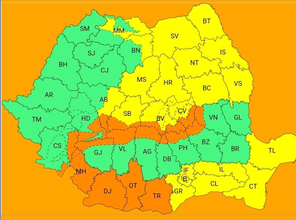 Tot pentru ziua de joi, meteorologii au emis COD PORTOCALIU de viscol puternic în Carpații Meridionali și sudul Carpaților Orientali, la altitudini de peste 1.700 de metri. Aici, rafalele de vânt vor depăși 85–120 km/h, zăpada va fi puternic troienită, iar vizibilitatea va scădea sub 50 de metri, condiții extrem de periculoase pentru deplasări montane.